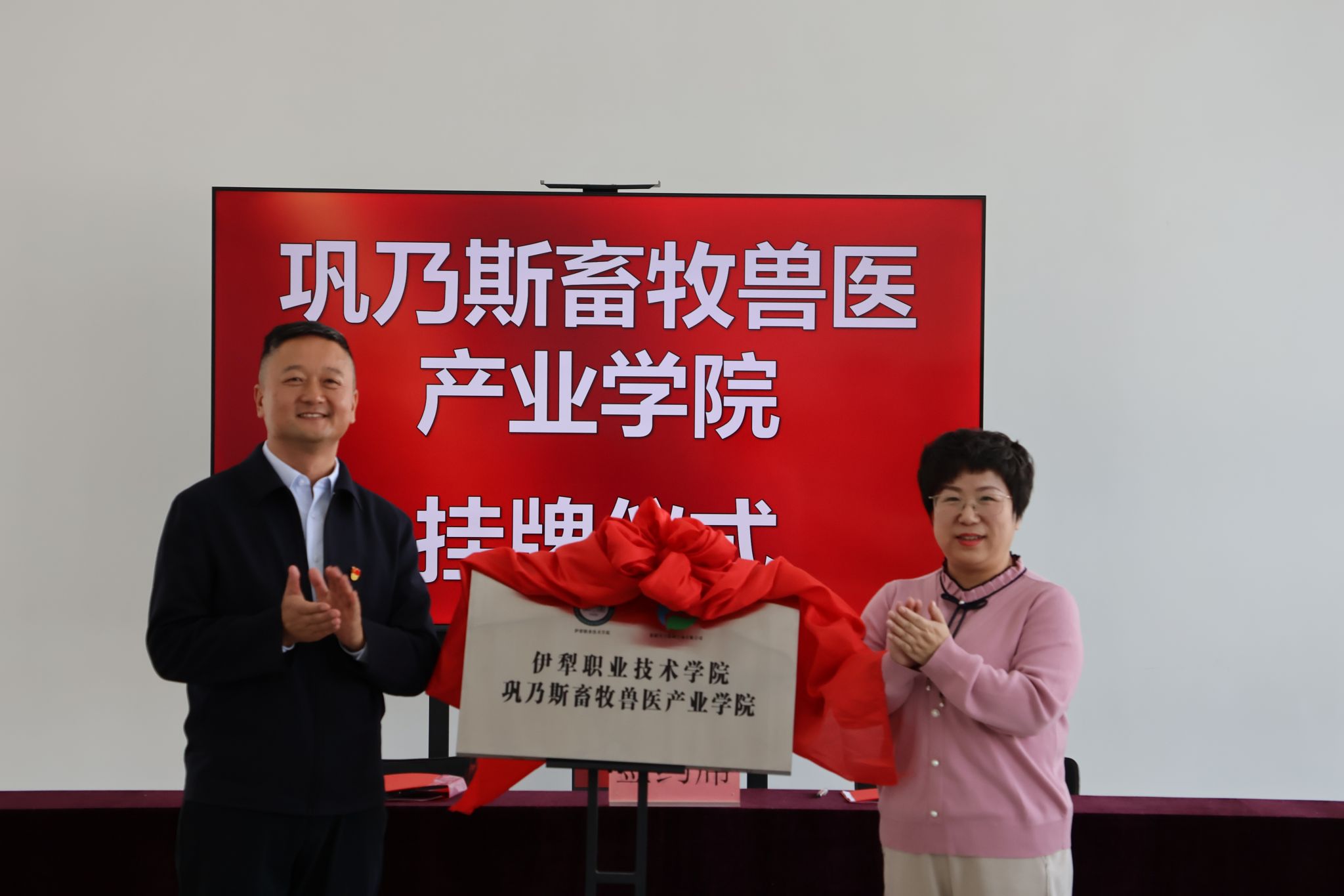 在全体与会人员的共同见证下,双方正式签署校企战略合作框架协议,标志着彼此的合作迈入实质性推进阶段。签约仪式后,现场同步举行揭牌仪式,周钰院长与安玮董事长共同为“伊犁职业技术学院巩乃斯畜牧兽医产业学院”“伊犁职业技术学院教师企业实践基地”揭牌,掀开了校企协同育人、共促产业发展的崭新篇章。