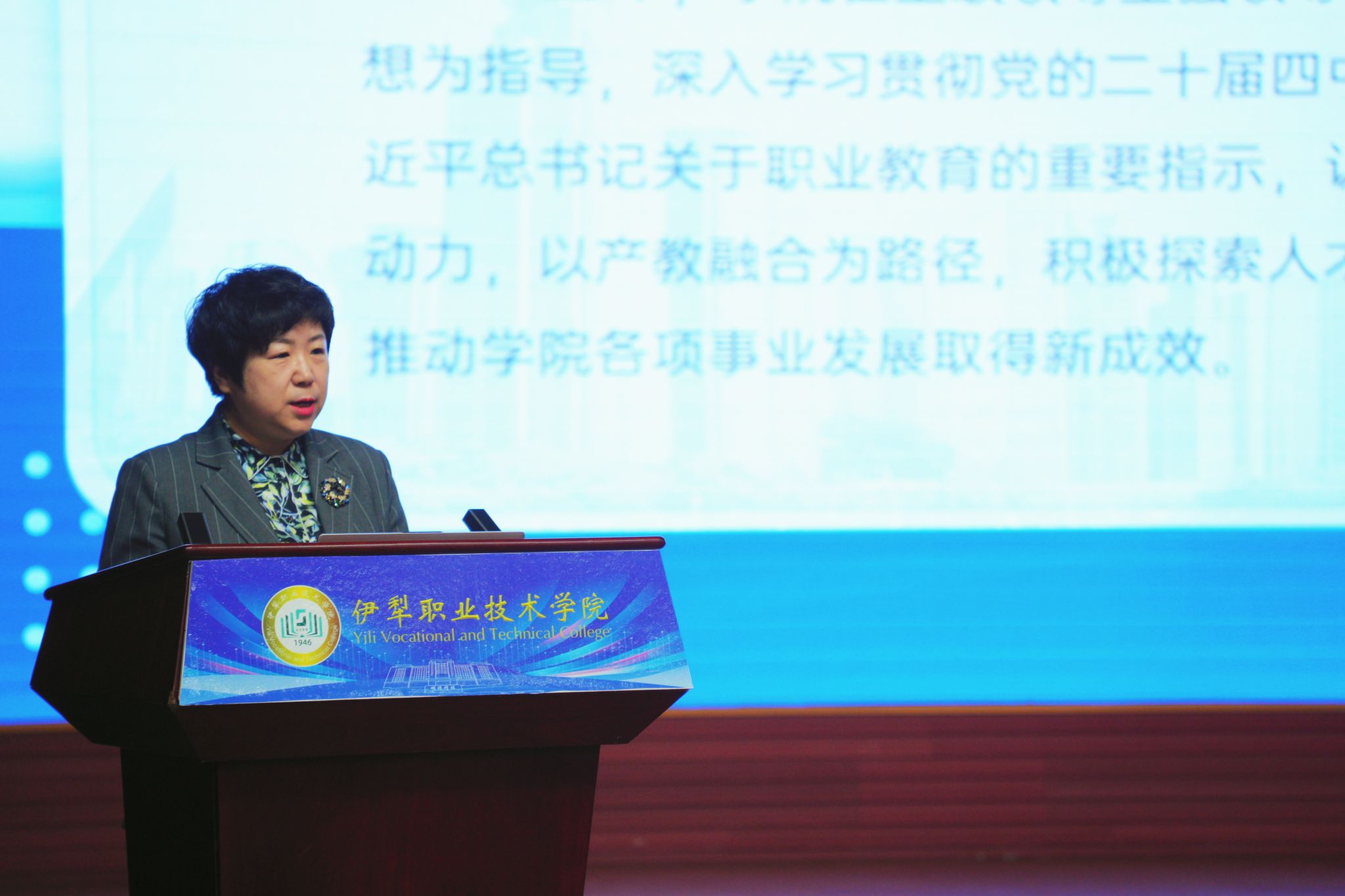 伊犁州教育局党组成员、副局长王嵘同志出席大会并致辞。致辞中充分肯定学院办学成果,强调职业教育需紧密对接区域产业需求,为伊犁州经济社会发展提供高素质技术技能人才支撑。