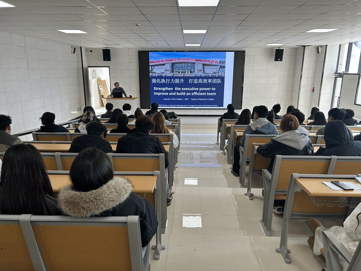 为深化职业教育内涵建设,助力学生顺利实现从校园到职场的过渡,2025年11月14日,伊犁职业技术学院霍尔果斯现代产业学院校区举行"强化执行力提升,打造高效团队"专题讲座。本次讲座由泰州职业技术学院援疆干部、伊犁职业技术学院副院长陈华北主讲,经济管理学院全体实习生参加。
